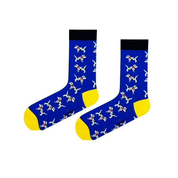 Step up your style with our Dalmatian Dog Pattern Blue Socks! Featuring playful dalmatian designs on a vibrant blue background with contrasting yellow toes and black cuffs, these unisex crew-length socks are perfect for animal lovers. Made from breathable fabric, they fit EU sizes 35 to 45 comfortably. Great for everyday wear or as a fun gift!