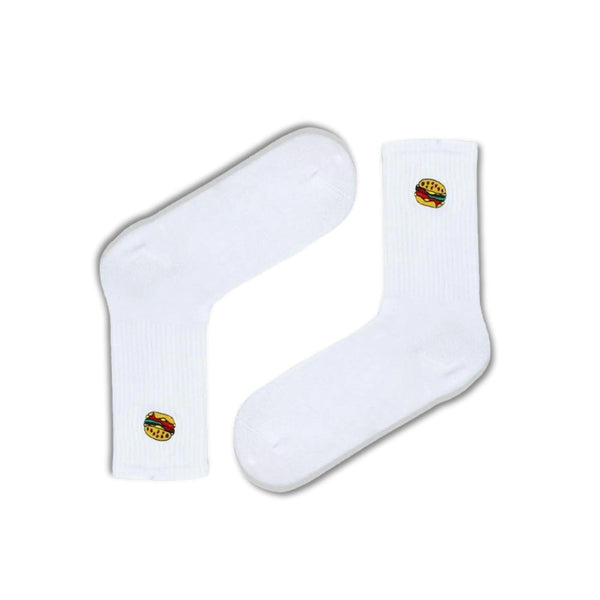 White Hamburger Socks! Embroidered with a juicy burger on each side, these unisex socks are perfect for foodies who love quirky fashion.