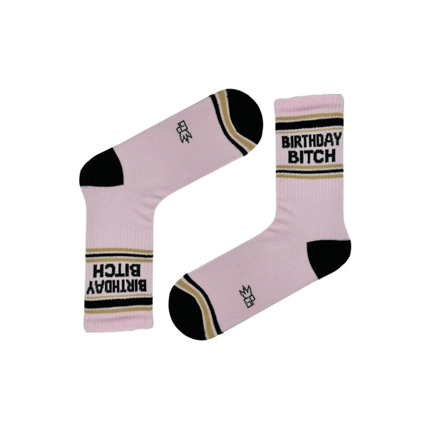 Celebrate in unapologetic style with our Birthday Bitch Socks ! These pastel pink socks are made for the bold and fabulous birthday queen. With eye-catching black-and-gold striped cuffs and bold lettering, they're as comfortable as they are fierce.